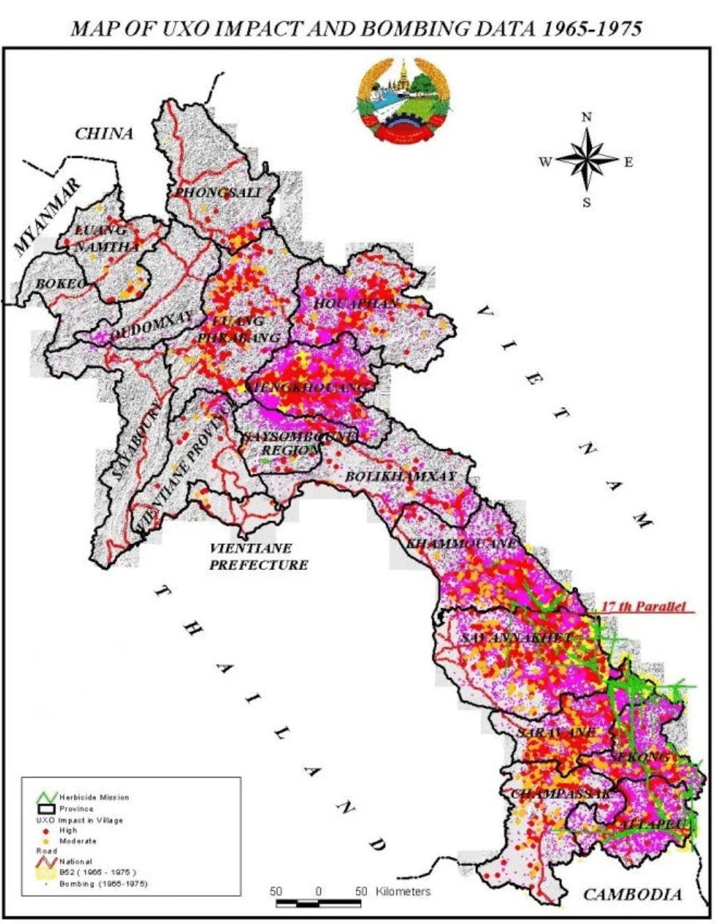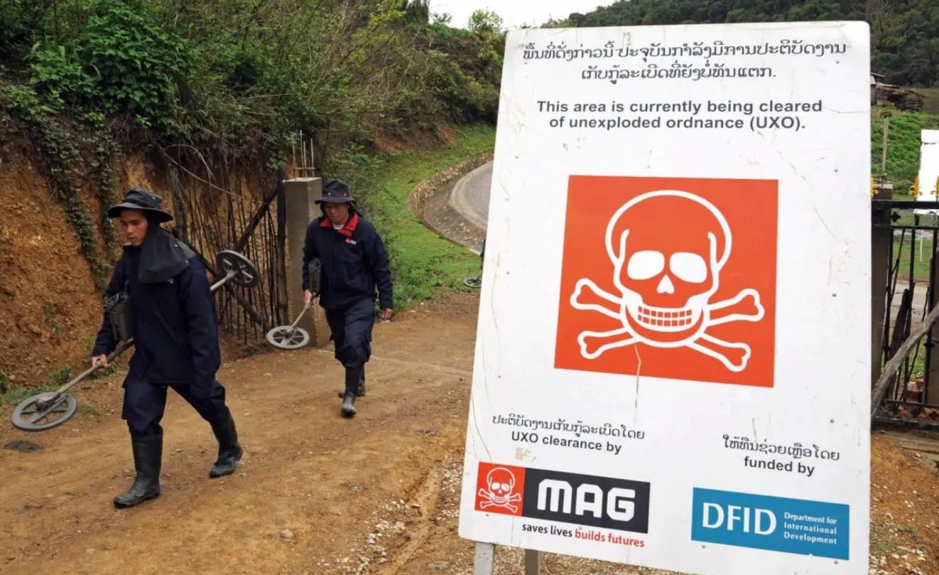 During the Vietnam War, the United States dropped enormous numbers of bombs on Laos. Many were cluster munitions, bombs that opened in the air and scattered smaller bomblets over a wide area. A lot of those never exploded. They stayed in fields, near villages, and under land people still have to use.